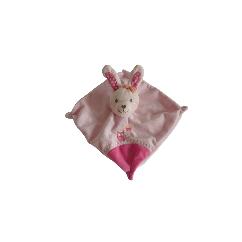 Doudou plat lapin 22x23 cm environ, rose motif chouette. Etat : Comme neuf. DOUDOU DIFFICILE A TROUVER