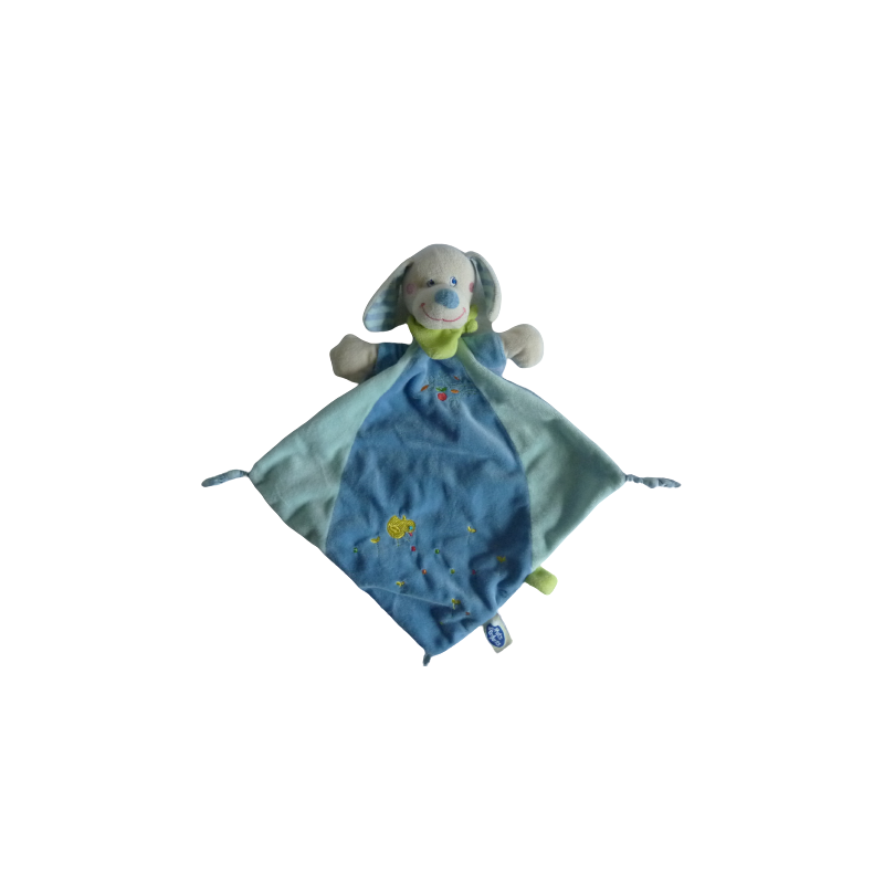 Doudou chien plat forme losange 44 cm environ, bleu divers motifs, 3 nouages. Etat : Très bon état (étiquette de la marque coupée)