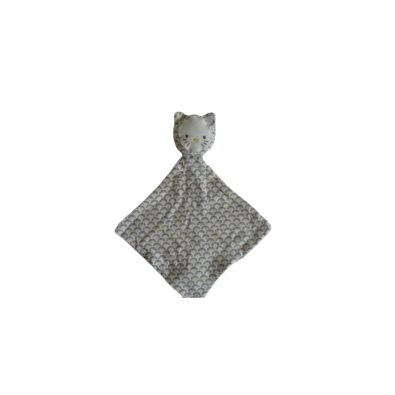 Doudou plat chat forme losange 32 cm environ blanc motifs. Etat : Comme neuf.Destinataire :