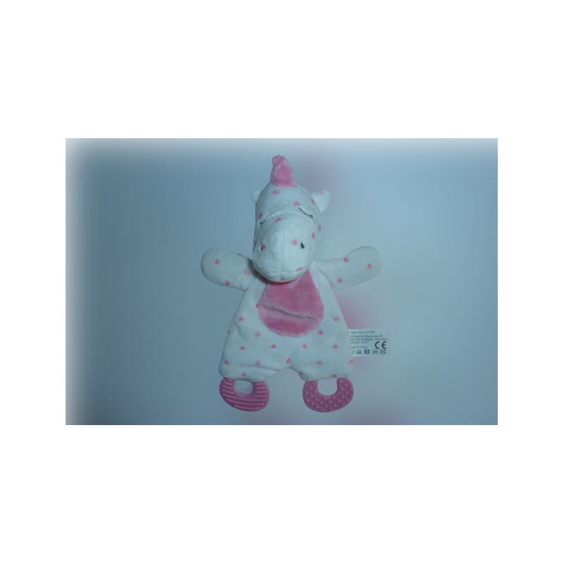 Doudou plat licorne 26 cm environ, anneaux dentition, matière bruissante, blanc rose motif cœur. Etat : Comme neufDestinataire :
