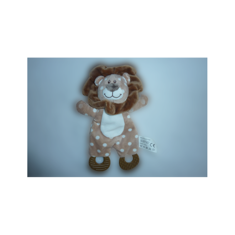 Doudou plat lion 27 cm environ, anneaux dentition, matière bruissante, blanc maron motif rond. Etat : Comme neuf