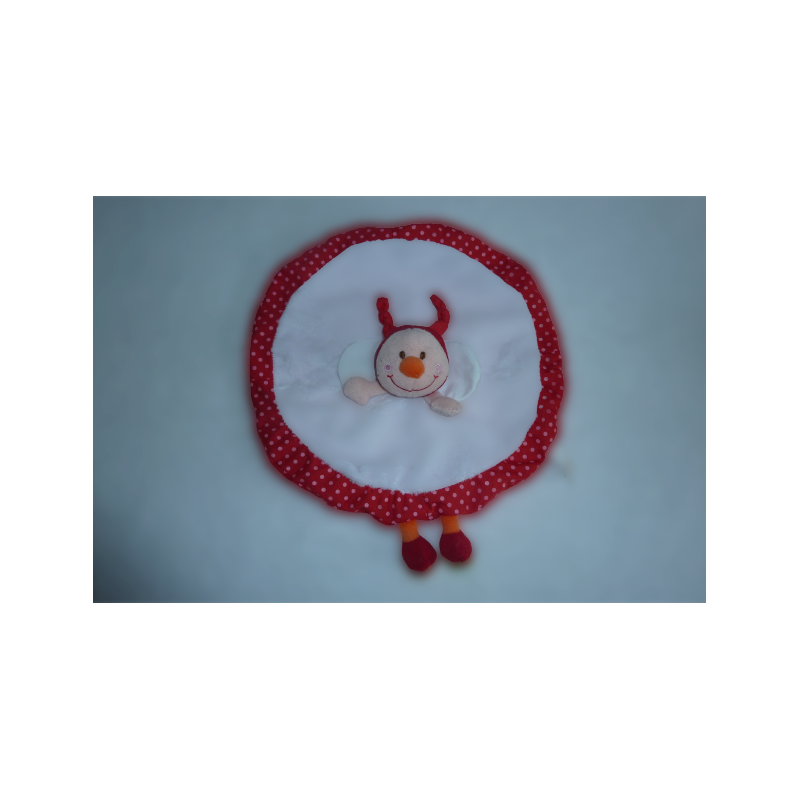 Doudou plat coccinelle forme ronde 24 cm environ, blanc rose motif pois. Etat : Comme neuf