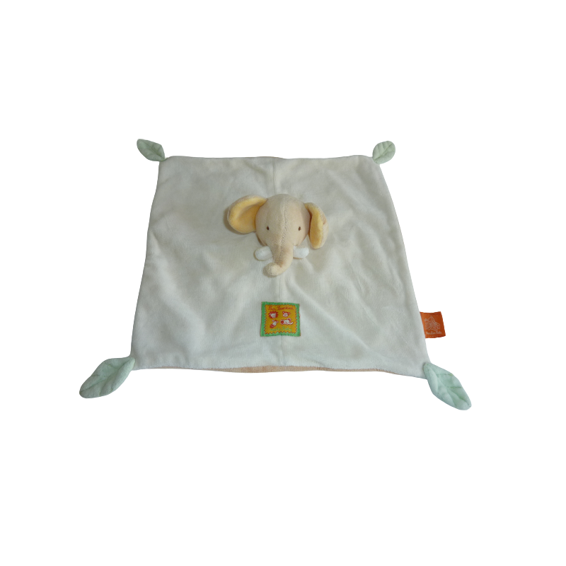 Doudou plat éléphant 26x27 cm environ, écru marron feuille verte. Etat : Très bon état