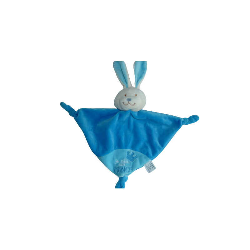 Doudou plat lapin forme losange 3 nouages 32 cm environ, bleu turquoise, Je suis un Prince et couronne brodés. Etat : Comme neuf
