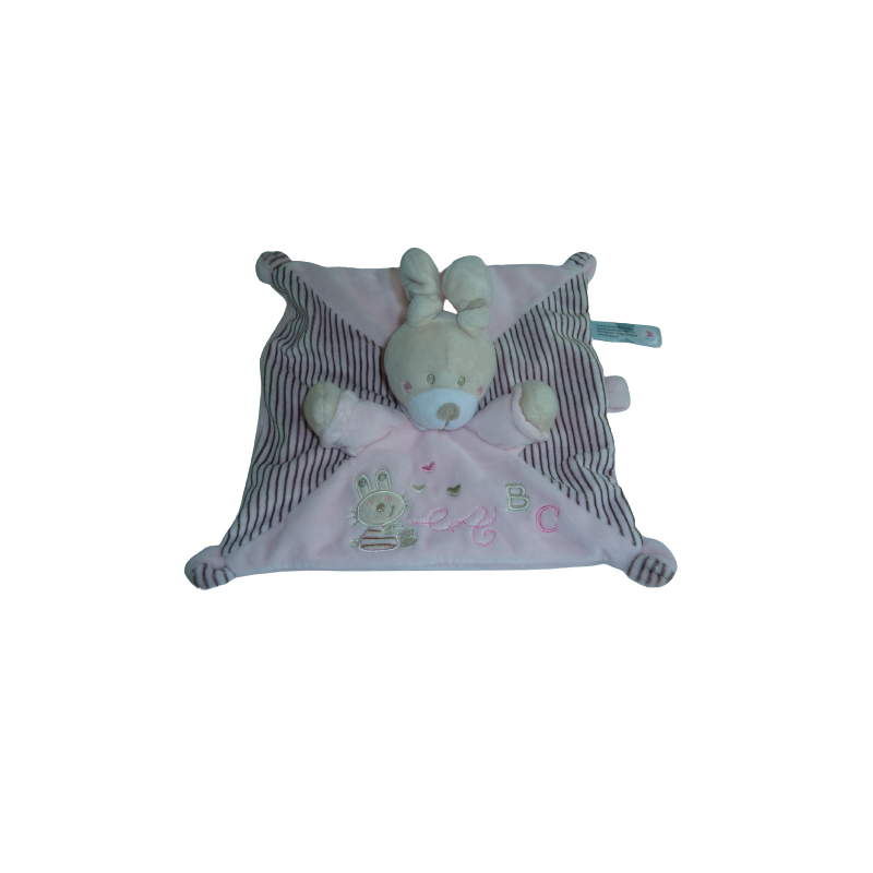 Doudou plat lapin 25x25 cm environ, attache tétine, rose motifs lapin cœurs ABC. Etat : Comme neuf