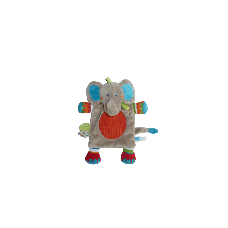 Doudou plat éléphant 28 cm environ, multicolore. Etat : Comme neuf