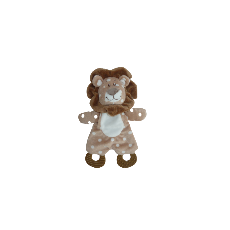 Doudou plat lion 26 cm environ, anneaux de dentition, matière bruissante, marron blanc motif pois. Etat : Comme neuf (étiquette de la marque coupée)