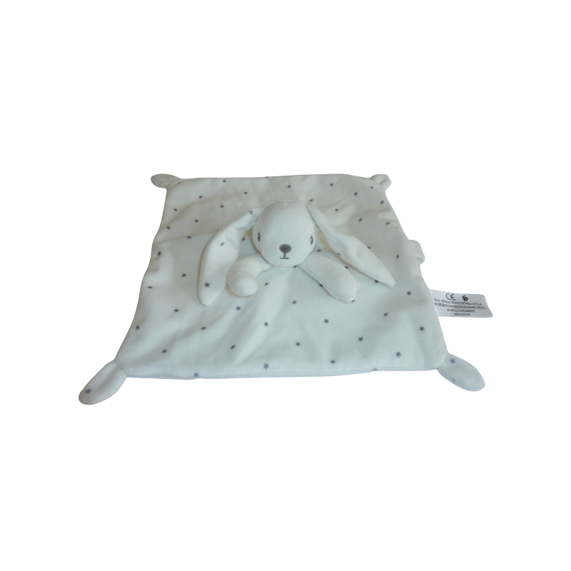 Doudou plat lapin 24x24 cm environ, attache tétine, blanc motif étoiles. Etat : Comme neuf