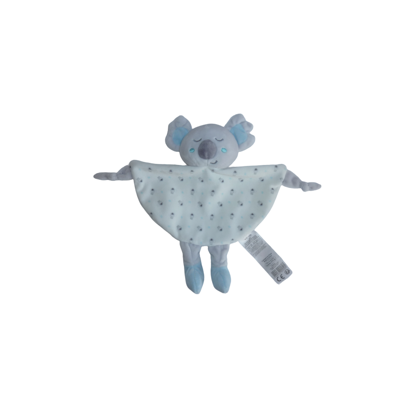 Doudou plat koala 26 cm environ, grelot 2 nouages blanc bleu motifs. Etat : Comme neuf
