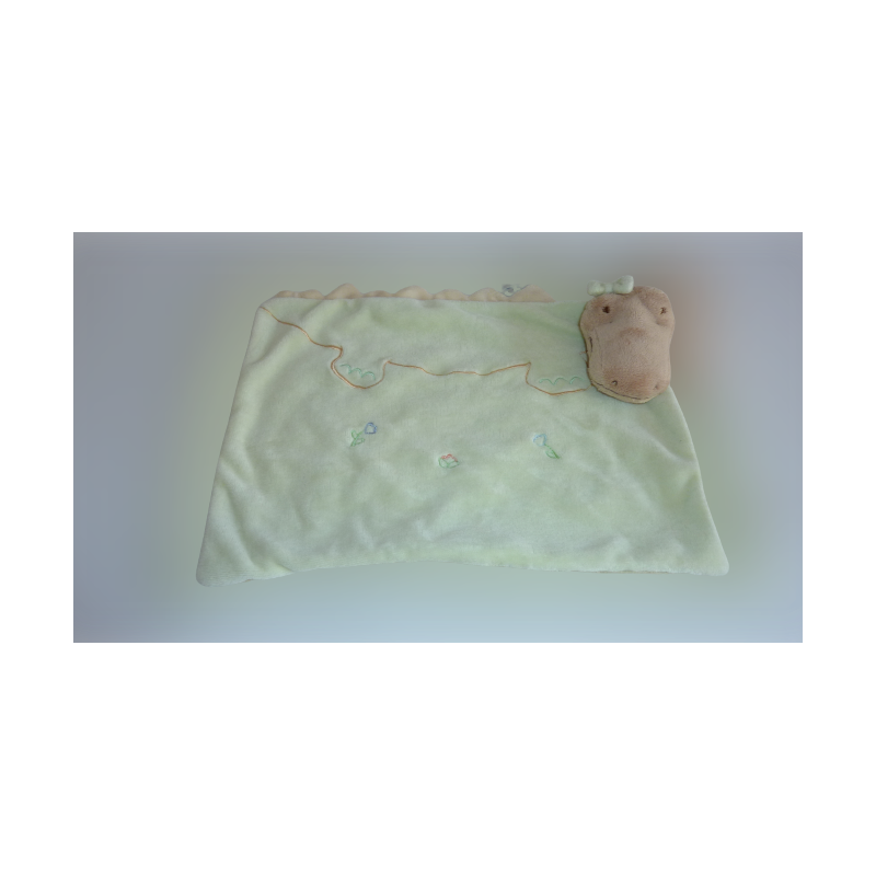 Doudou plat crocodile 26 cm environ de large, vert motifs. Etat : Très bon état