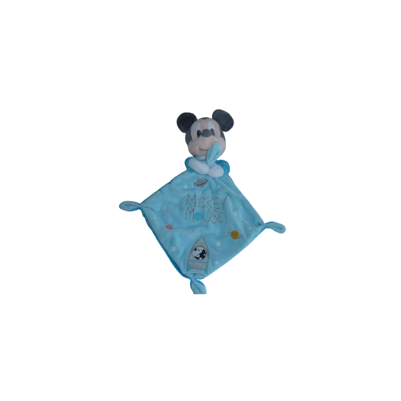 Doudou plat souris Mickey, forme losange 34 cm environ, bleu turquois motifs planète fusée. Etat : Comme neuf (étiquette de la marque coupée)