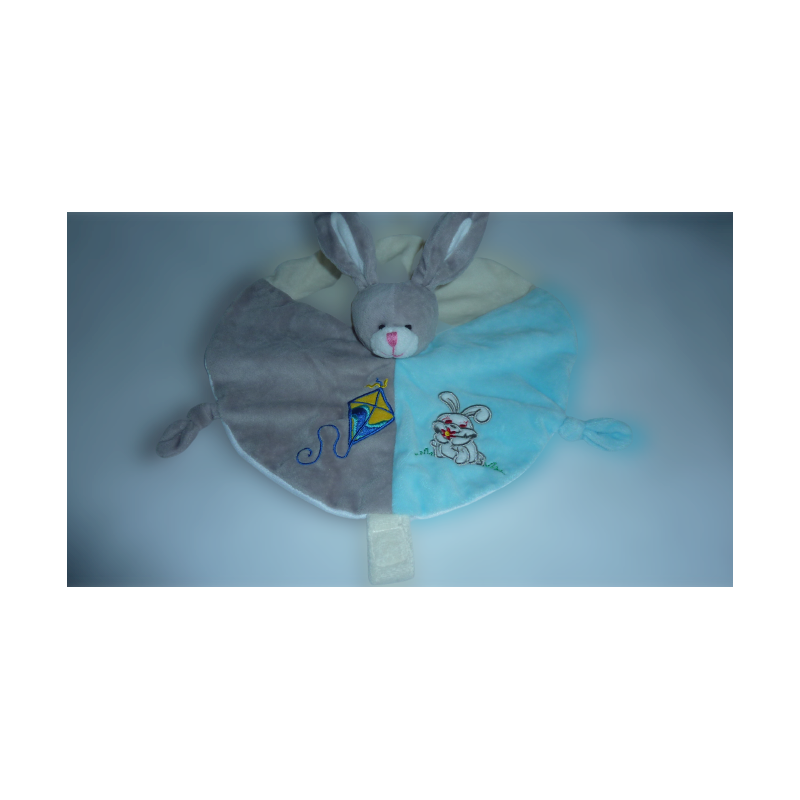 Doudou plat forme ronde 30 cm environ, attache tine, 2 nouages, bleu turquoise, cre taupe motifs cerf volant et lapin. Etat : Comme neuf