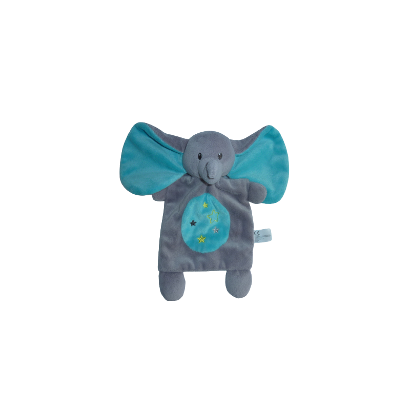 Doudou plat éléphant 26 cm environ, gris turquoise étoiles brodées.Etat : Comme neuf