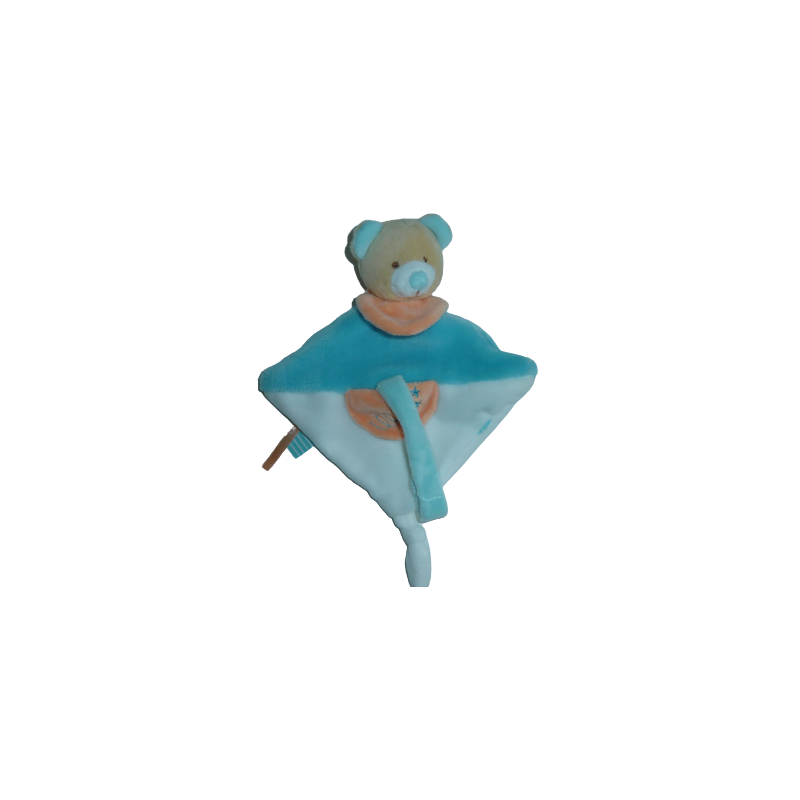 Doudou attache tétine 26 cm environ tout compris, bleu turquoise blanc orange. Etat : Doudou en parfait état mais l'étiquette de la marque coupée ainsi qu'une autre étiquette