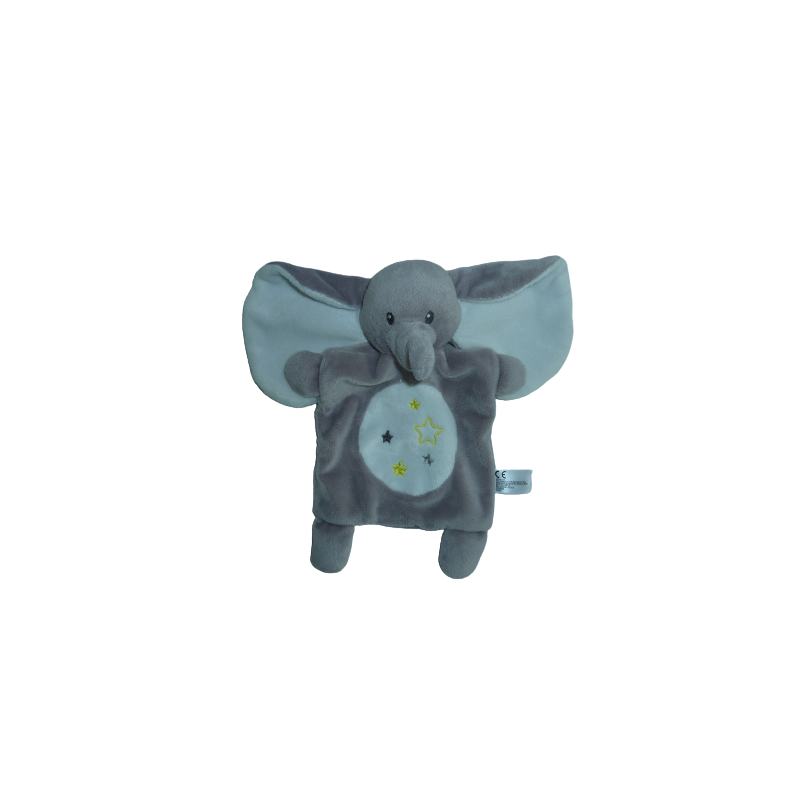 Doudou plat 25 cm environ, gris blanc motif étoiles. Etat : Comme neuf