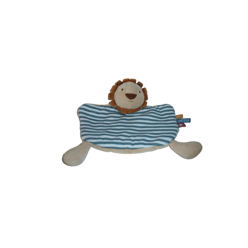 Doudou plat lion 25 cm environ, grelot, marron rayures bleu blanc. Etat : Comme neuf (étiquette de la marque coupée)Destinataire :