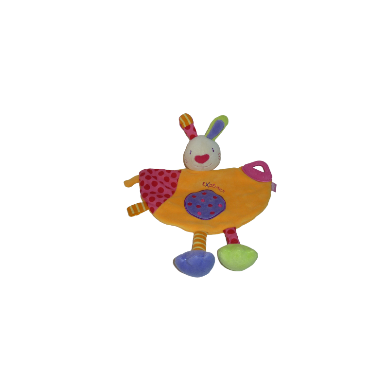 Doudou plat lapin 30 cm environ, anneau de dentition, multicolore . Etat : Comme neuf
