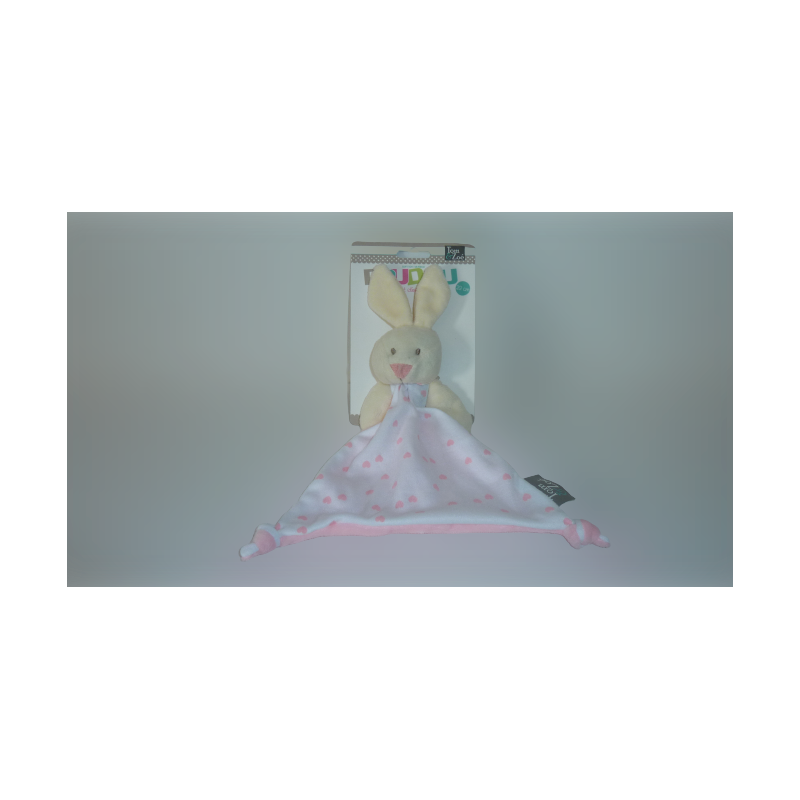 Doudou plat lapin 28 cm environ tout compris, crème blanc imprimé cœur rose rose au verso. Etat : Neuf
