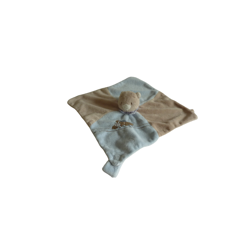 Doudou plat ours 26x26 cm environ, attache tétine, marron bleu motif train. Etat : Le doudou est en parfait état mais les étiquettes autour du doudou ont été coupéDestinataire :