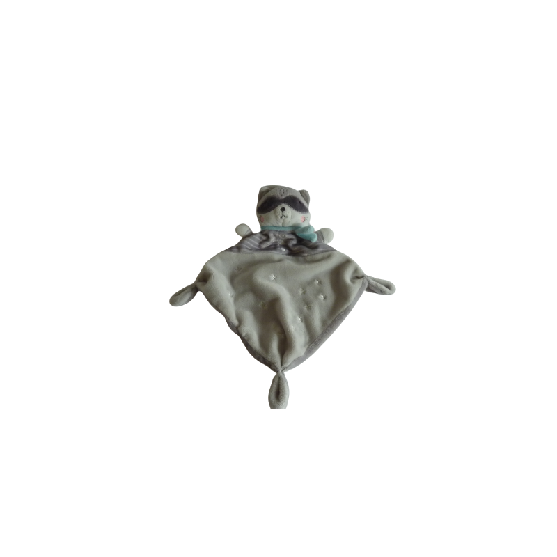 Doudou plat raton laveur forme losange 28 cm environ, gris motif étoiles. Etat : Comme neuf (étiquette de la marque coupée)Destinataire :