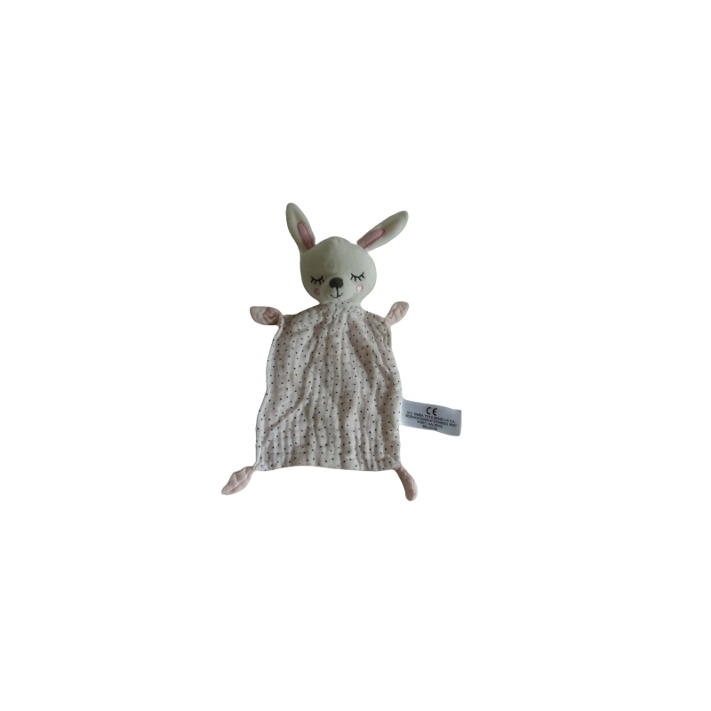 Doudou plat lapin 25 cm environ sans compter les oreilles, tissu lange rose pâle motif pois. Etat : Comme neuf