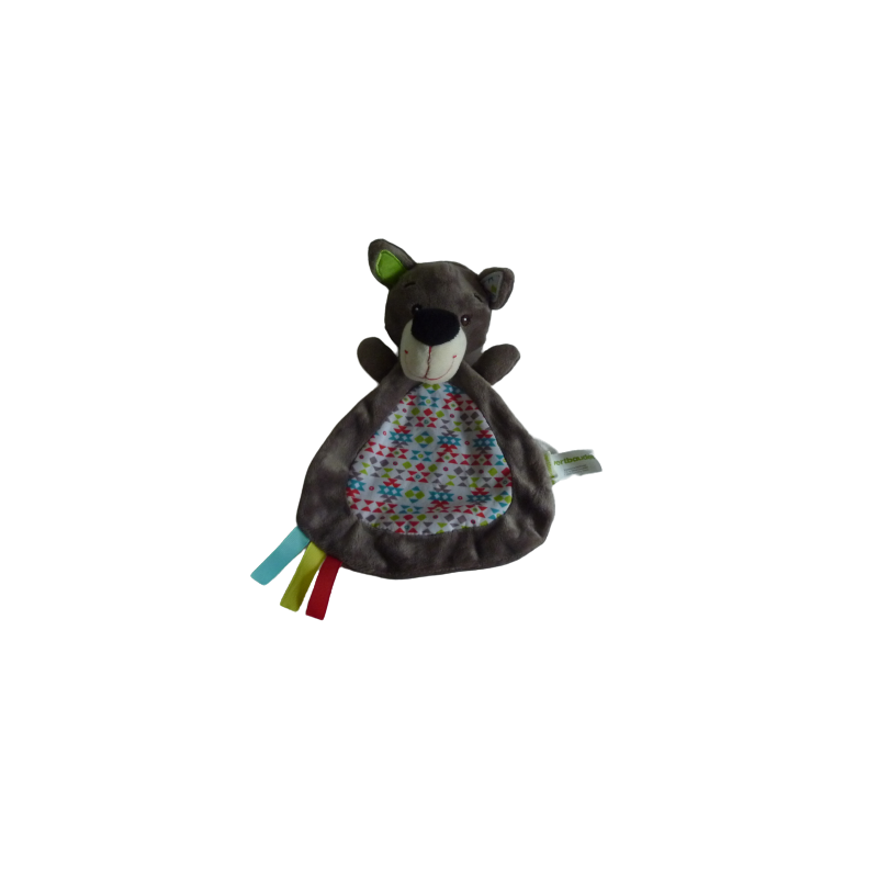 Doudou plat loup 26 cm environ, marron motifs multicolore. Etat : Comme neuf