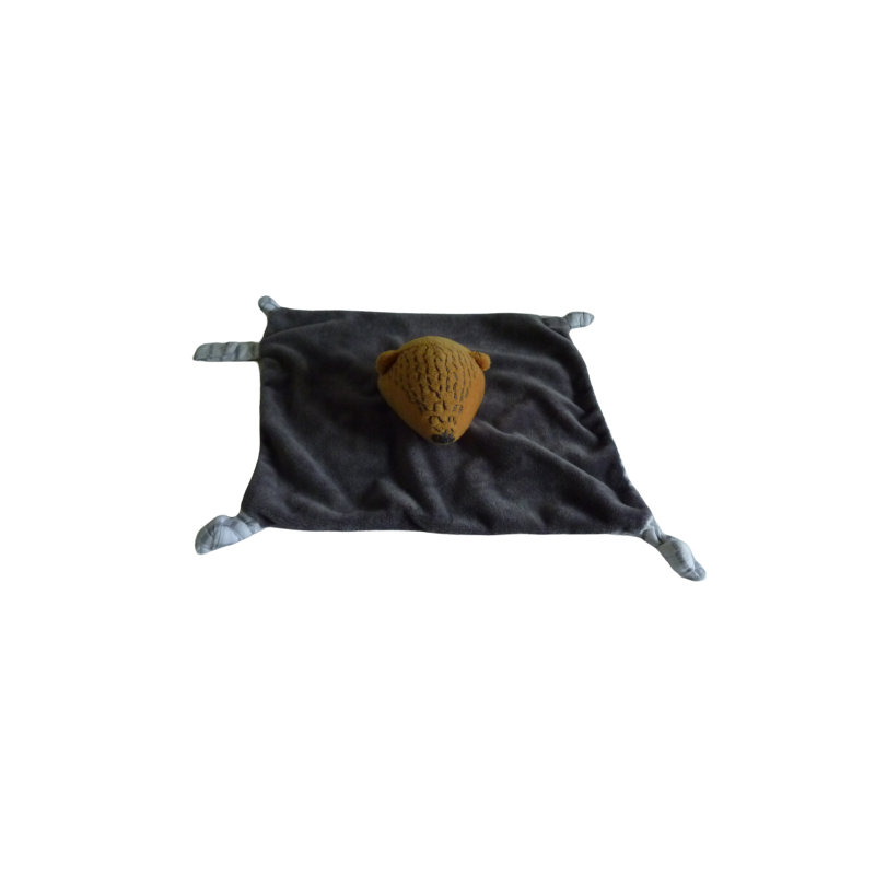 Doudou plat renard 22x25 cm environ, 4 nouages, attache tétine, gris rayures. Etat : Très bon état (petite tache sur l'attache tétine et le velcro adhère peu mais d'origine)Destinataire :