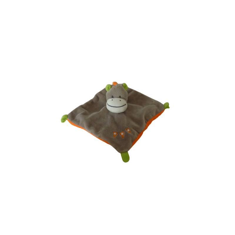 Doudou plat cheval 19x19 cm environ, taupe orange. Etat : Comme neuf (étiquette informations coupée)Destinataire :