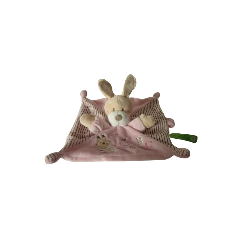 Doudou plat lapin 24x24 cm environ, attache tétine, rose motif ABC lapin cœurs, 100% recycled. Etat : Comme neuf