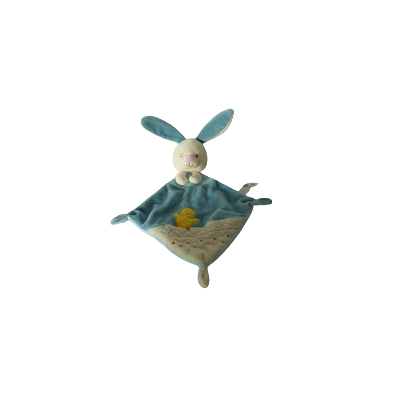 Doudou plat lapin forme losange 30 cm environ sans compter les oreilles, bleu motif poussin. Etat : Comme neuf