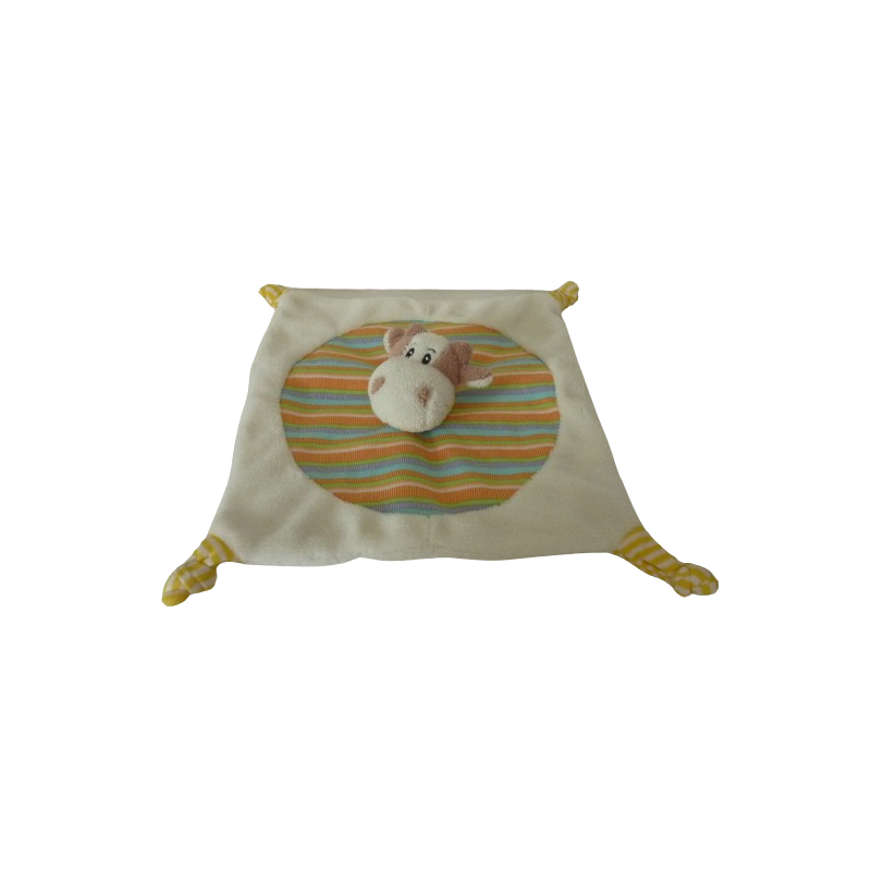 Doudou plat vache 4 nouages 24x24 cm environ, blanc rayures multicolores. Etat : Excellent état (étiquette marque coupée)Destinataire :