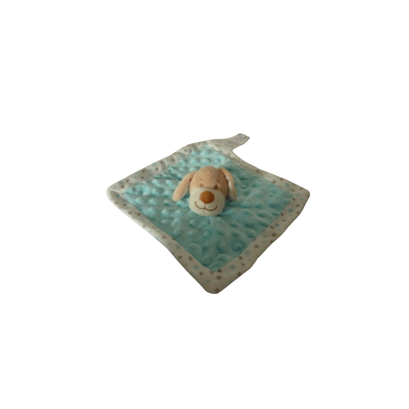 Doudou plat chien 22x22 cm environ, bleu turquoise motif étoiles. Etat : Comme neuf