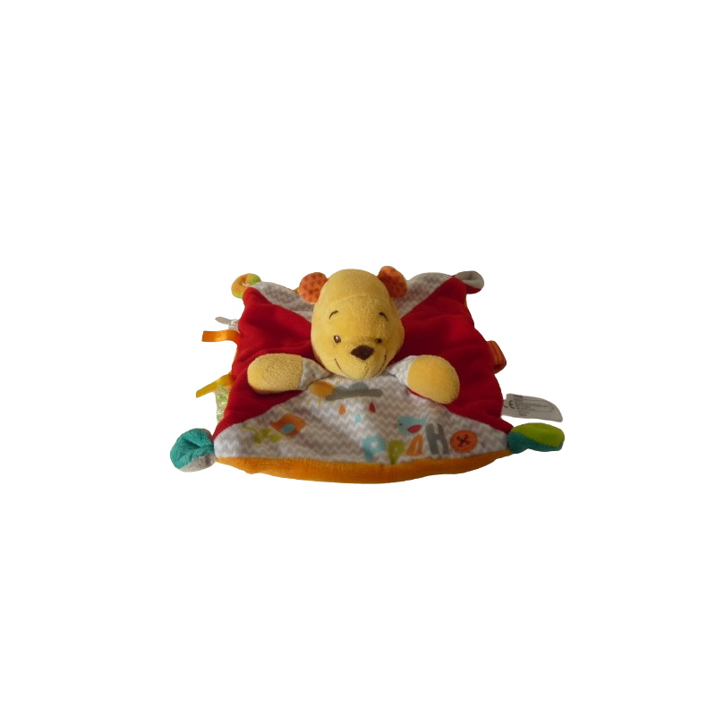 Doudou plat Winnie 18x18 cm environ, attache tétine, rouge orange motifs. Etat : Parfait état juste un ruban qui a été coupéDestinataire :