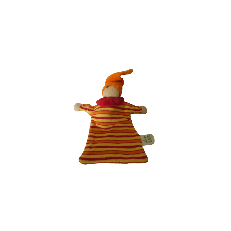 Doudou plat lutin poupée 19 cm environ sans compter le bonnet, rayures rouge jaune orange, bonnet orange, coton bio. Etat : Comme neufDestinataire :