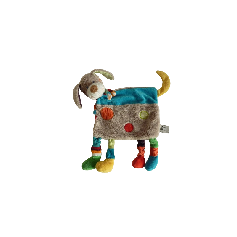 Doudou plat chien 28 cm environ de hauteur, multicolore. Etat : Parfait état (juste mini accro à l'intérieur d'une oreille dû à l'attache étiquette boutique)