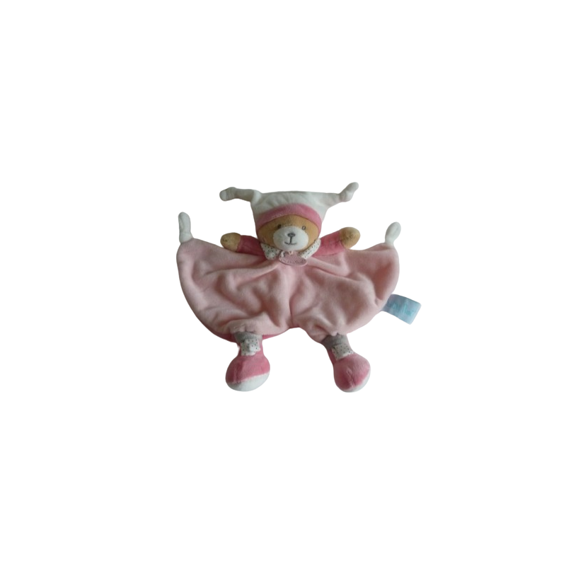Doudou plat ours 25 cm environ sans compter le bonnet, rose blanc. Etat : Comme neuf