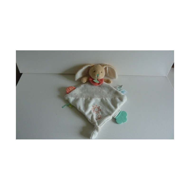Doudou plat lapin forme losange 38 cm environ sans compter les oreilles, 1 nouage, anneau de dentition, matière bruissante, marron blanc gris . Etat : Comme neuf