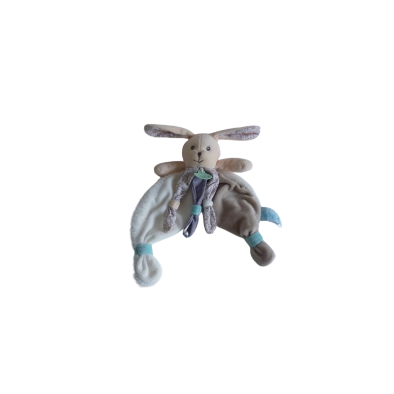 Doudou lapin plat 26 cm environ sans compter les oreilles, blanc marron. Etat : Comme neufDestinataire :