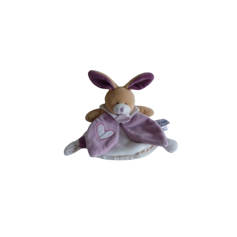 Doudou plat lapin 24 cm environ de hauteur, blanc parme violet motif coeur. Etat : Comme neuf
