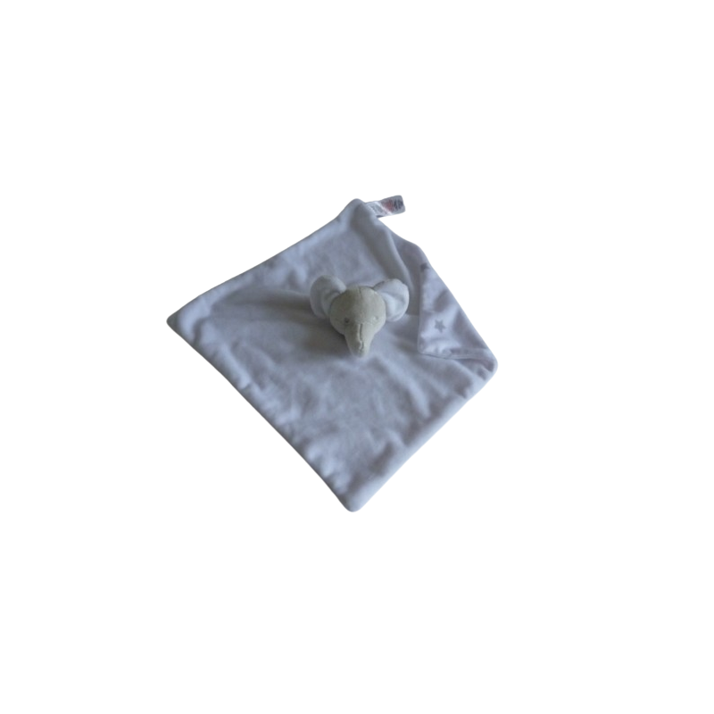 Doudou plat éléphant 31x31 cm environ, blanc motif étoiles au verso. Etat : Comme neufDestinataire :