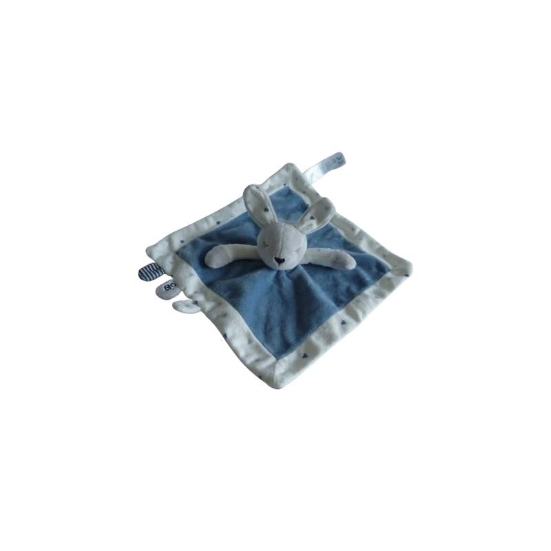 Doudou plat lapin 24x24 cm environ, bleu blanc motif coeur. Etat : Neuf
