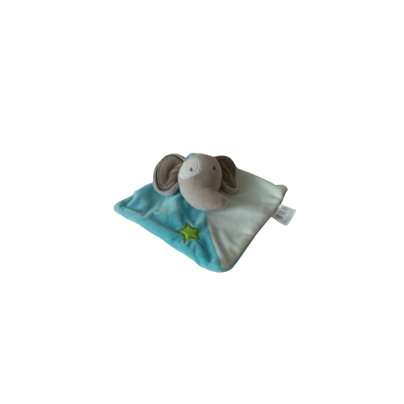 Doudou plat éléphant 20x20 cm environ, bleu turquoise blanc motif étoile verte. Etat : comme neuf