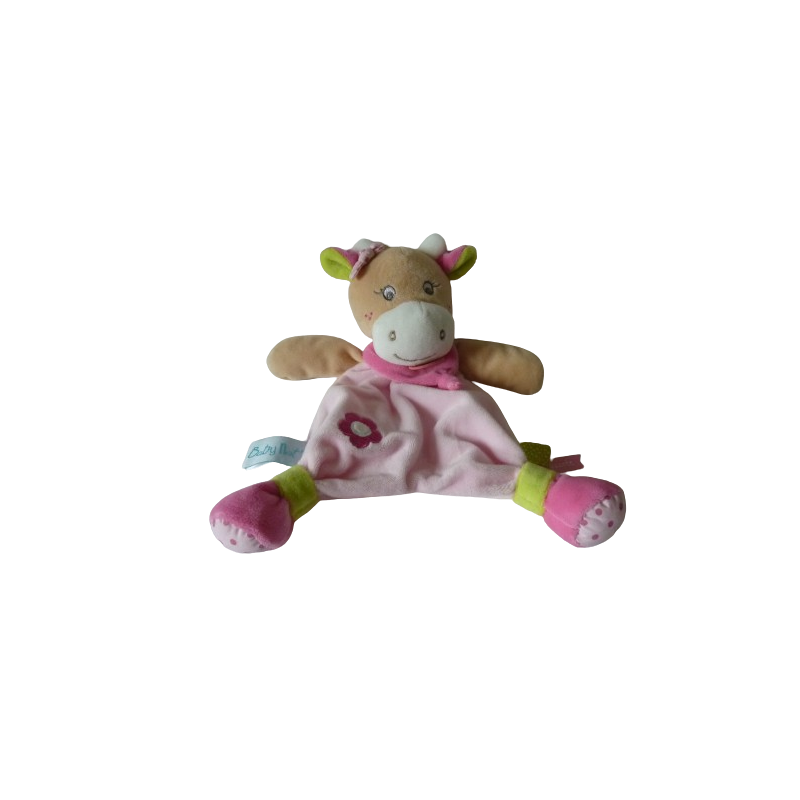 Doudou plat vache 28 cm environ, rose vert marron motif fleur. Etat : Comme neuf