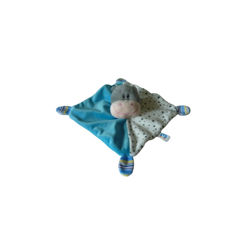 Doudou plat hippopotame 22x22 cm environ, bleu turquoise blanc motif étoiles. Etat : Comme neufDestinataire :