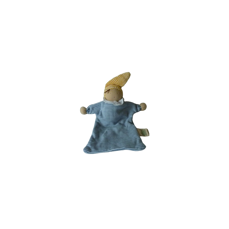 Doudou plat lutin poupée20 cm environ sans compter le bonnet, rayures bleu blanc, bonnet blanc jaune, coton bio. Etat : Comme neuf
