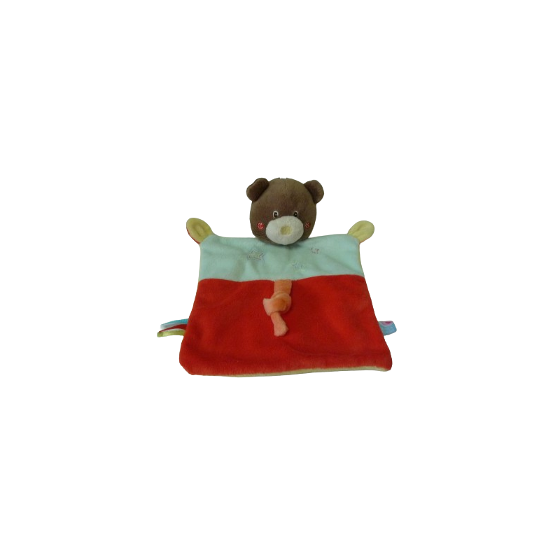 Doudou plat ours 24 cm environ, rouge jaune turquoise motif étoiles. Etat : Comme neufDestinataire :