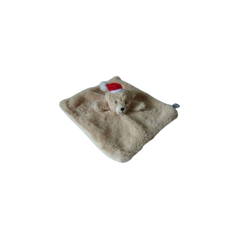 Doudou plat ours marron beige 24x24 cm environ, bonnet rouge blanc de noël. Etat : Comme neuf