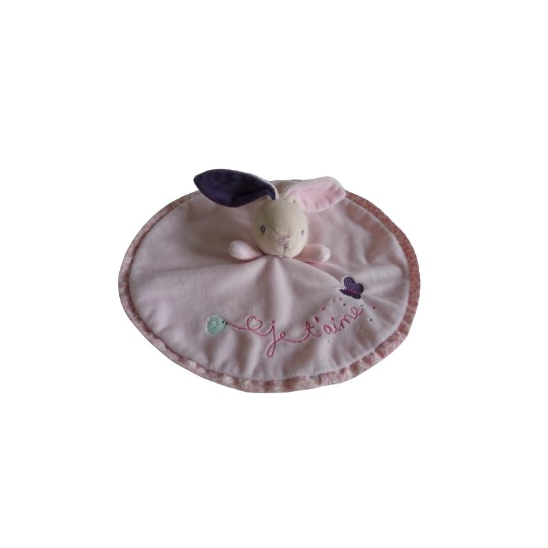 Doudou plat lapin forme ronde 28 cm environ, rose motif papillon oiseau, Je t'Aime brodé. Etat : Comme neuf