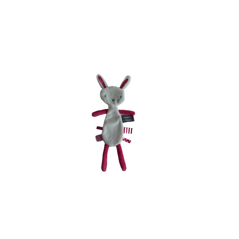 Doudou plat lapin 32 cm environ blanc fuschia bordé d'étiquettes . Etat : Comme neufDestinataire :