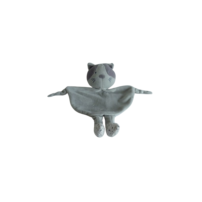 Doudou plat chat 24 cm environ, grelot, 2 nouages, gris motif étoiles lune aux pieds. Etat : Comme neuf (étiquette marque coupée)Destinataire :